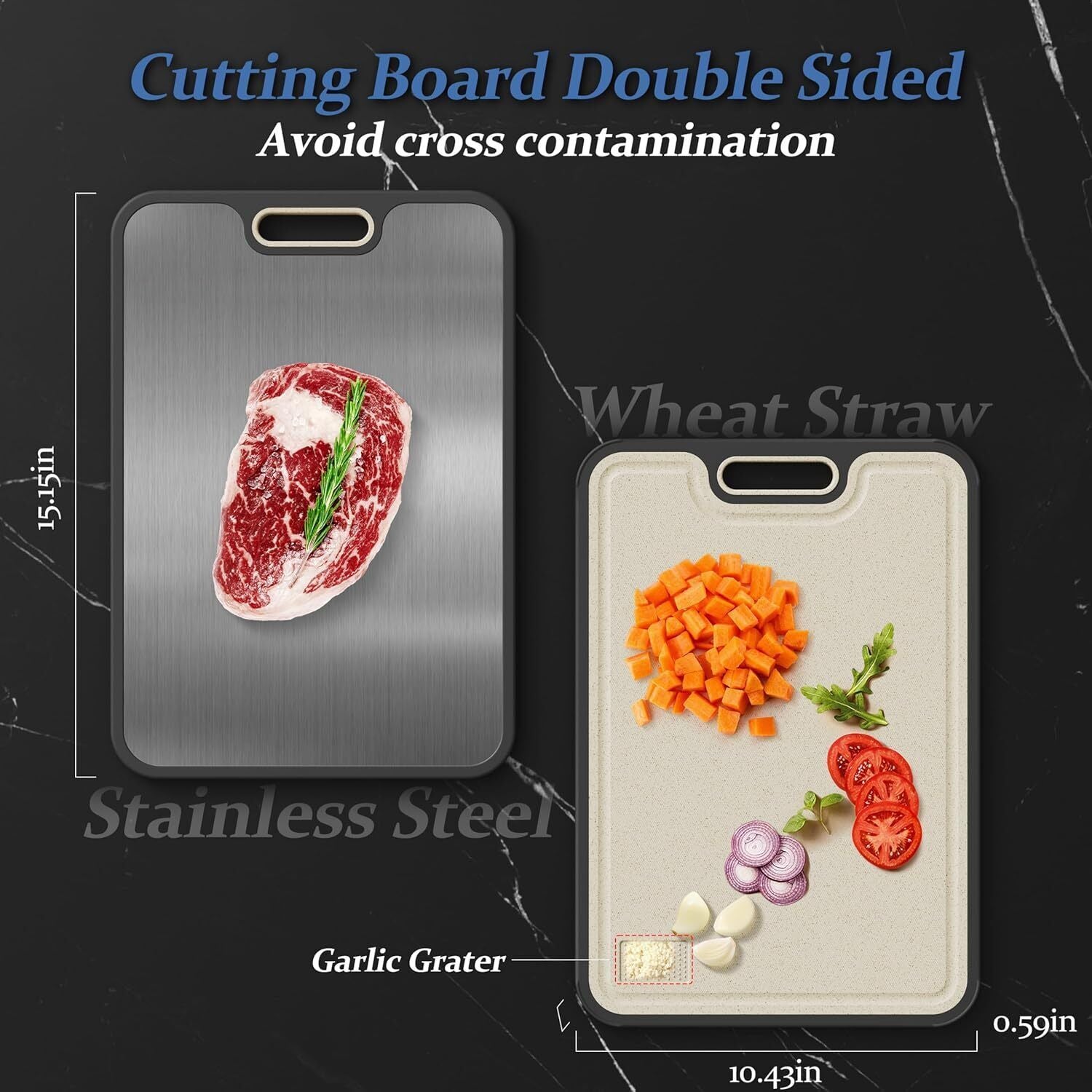 - One side is crafted from robust stainless steel for meat chopping board, while the other side features wheat straw PP, ideal for all your fruit and vegetable prep